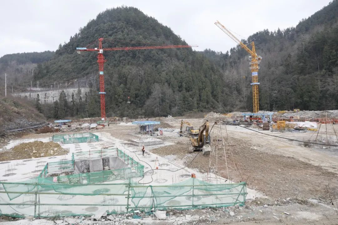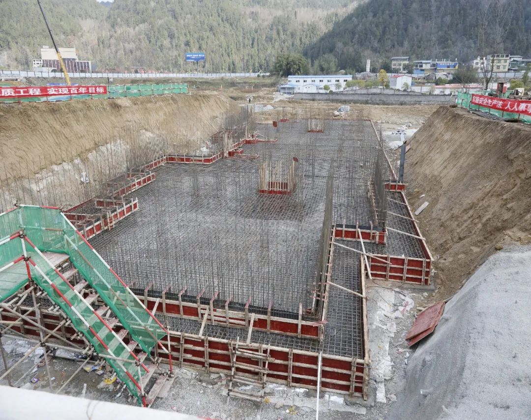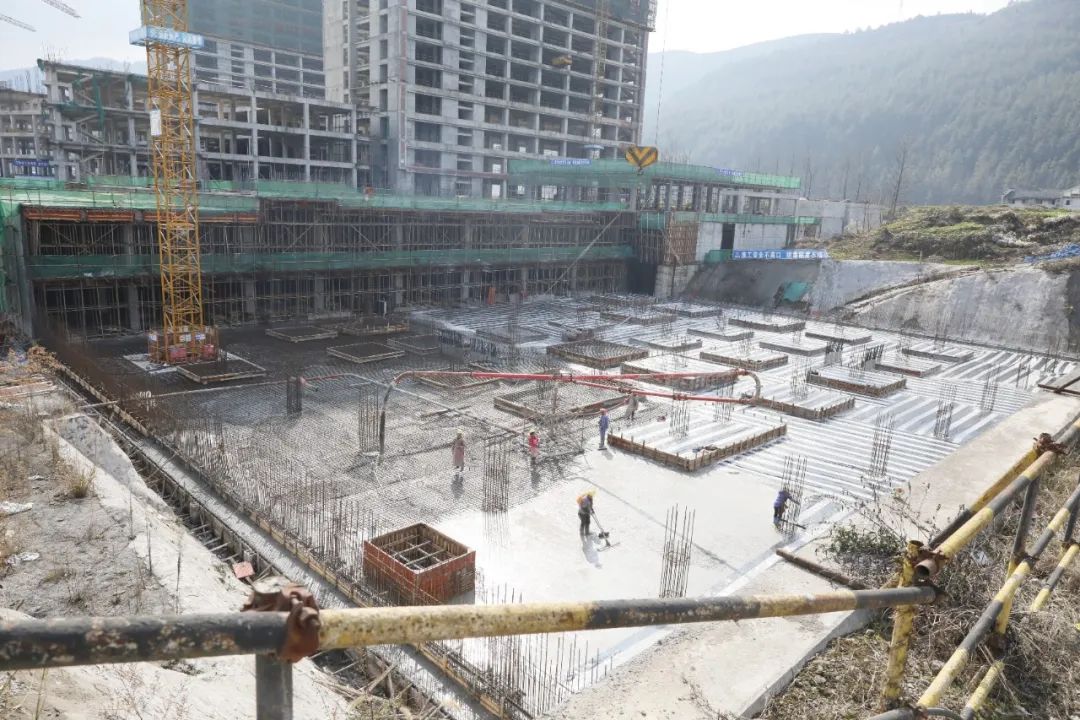 多輛工程機(jī)械有序作業(yè),挖掘機(jī)、推土機(jī)、塔吊機(jī)轟鳴聲震耳欲聾、重型卡車來回穿梭蕩起滾滾煙塵。150余名工人正進(jìn)行鋼筋、支模、混凝土澆筑等。